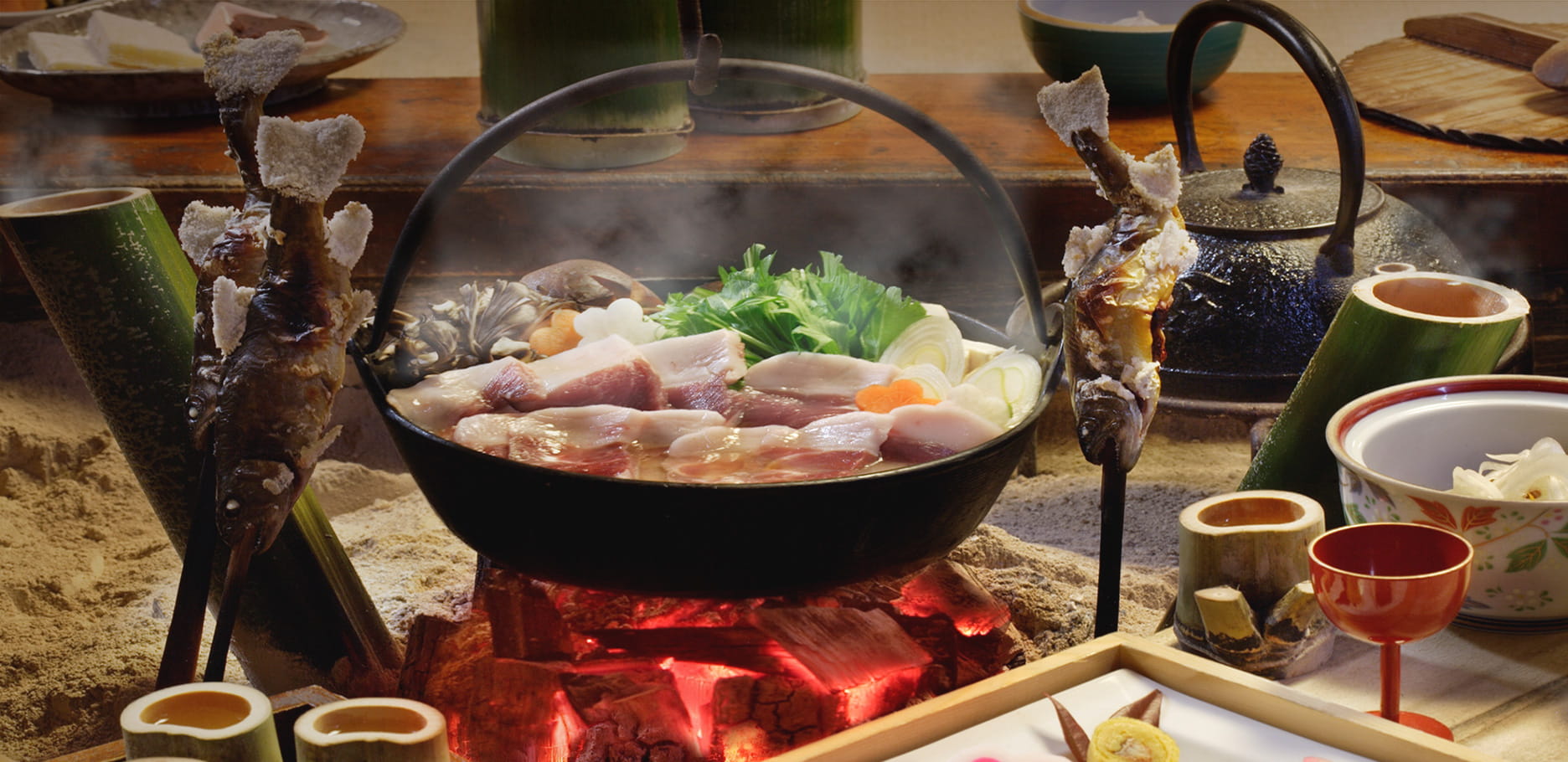 囲炉裏を囲んで楽しむ、